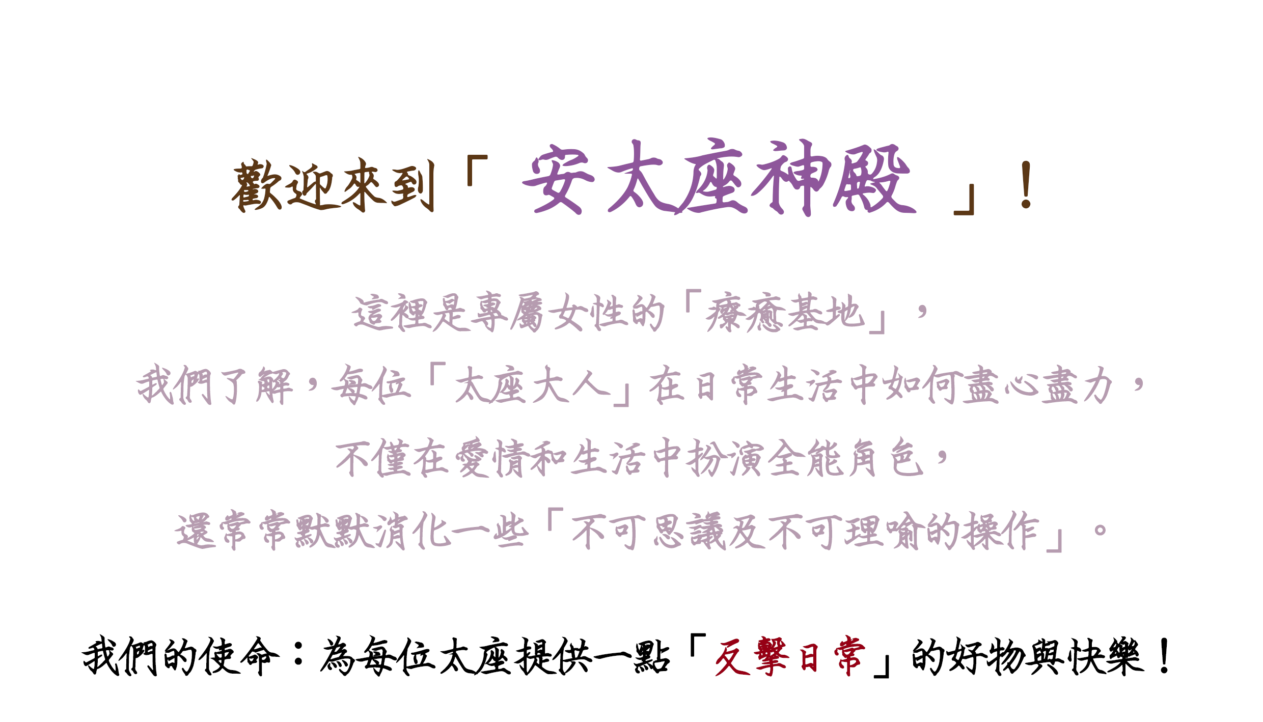 「安太座神殿」也是您的專區!我們的商品和內容,不是為了「解決某個人」,而是為了妳獲得「生活的掌控感」。這裡讓妳充滿選擇自由與愉悅,即便沒有「另一半」的挑戰,也一樣能滿足妳對生活的獨特品味。